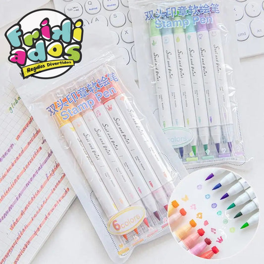 Set 6 Marcadores Dobles (Timbre y Punta Pincel).